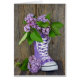 Lilac bouquet i lila high top sneaker på rustic laded wood.