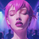 Lilac Dream Whisper - A Serene and Etheral Lila Porträtt. En seren och eetal nära porträtt av ett feminin ansikte i lera och vita huvar. De mjuka stiliserade penseldragen och abstrakt inslag ge i den här teckningen har en drömmande kvalitet som uppmanar tittaren att förlora sig i subjekt drömmande lugn och själviskhet.