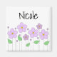 En kvadratmagnet med lilaska blommor och namn. Anpassa magneten med bland annat speciella namn eller text, färg i bakgrunden.