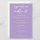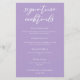 Denna vackra lilac bröllop namnteckning cocktails-meny har en vacker vit typografi på en mjuk lila för en vår-ceremoni på eftermiddagen. Lavender pastel-drycker som beskrivs i ett känsligt färg-val för en elegant tillfälle.