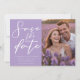 Den här vackra lilac Save the Date Card har en vacker vit typografi på en mjuk lila-bakgrund för en vår-ceremoni på eftermiddagen bredvid ett foto av förlovningen. Inbjudan är ett känsligt färg-val för en elegant tillfälle i trädgården.