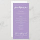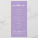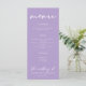 Den här vackra lilac-middagsmenyn i bröllop har en vacker vit typografi på en mjuk lila för en ceremoni i vår på eftermiddagen. Lavender pastel decor är ett känsligt färg-val för en elegant tillfälle.