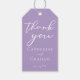 Denna vackra lilac-märkre i bröllop har en vacker vit typografi på en mjuk lila bakgrund för en vår eftermiddagsceremoni. Lavender Pastel-favorittaggar är ett känsligt färg-val för en elegant tillfälle.