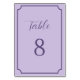 Bröllop-bordsnummer i lilac-toner med mörk lavender-bokstäver i serif och script typsnitt inuti ram