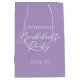 This lovely lilac purple bachelorette party gift bag features classic white script for a bride who is going to have an upscale event with her bridesmaids. Chic, minimalist pastel purple bridesmaid gift bags.