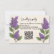🌸 Frontdesign Etheral-läppar i mjuk lavender och vrida lila ram på kortet i en ljus, graciös arrangemang. Blomkanten rör sig försiktigt längs kant och skapar en lugn blommigt aura samtidigt som utrymmet för personligens ordalydelse bevaras. I kortets kärna ger en diskret placerad QR-kod en contemporary pekande, vilket innebär att den digitala övergången kombineras med tidlös romantik. Integrationen känner sig sömlös och tillför modern funktionalitet utan att störa designens lugn. ✨ Baksida På motsatt sida sitter ett förfinat monogram elegant centrerat, som antingen är skrivet i ett minimalistiskt serif- eller flytande skript, beroende på parets estetiska egenskaper. Under den är bröllop-datumet typset med underskattad charm. Layouten är fortfarande skarp och oklanderlig, vilket gör det möjligt för parets personliga märke att stå på egen hand. Det är en tyst balans mellan tradition och innovation, designad för par som vill ha en meningsfull keepy med ett modernt kant.