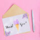 Denna syren-tema bröllopsfest-tack-kort är en del av Ice Cream Social-kollektionen, med en pastelljus bakgrund och blommor, perfekt för att avsluta din fest i stil!