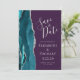 Det moderna bröllop spara datum-kortet från elegantens lämnat kant har en tårblått vattenfärgsagat gräns som trimmas med silver faux glitter. Anpassadet kombinerar handskrift, tryckplåt och kursivt typsnitt med silver grått mot lila.