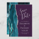 Det moderna bröllop spara datum-kortet från elegantens lämnat kant har en tårblått vattenfärgsagat gräns som trimmas med silver faux glitter. Anpassadet kombinerar handskrift, tryckplåt och kursivt typsnitt med silver grått mot lila.