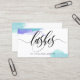 En chic och slå visitkort för en snärtkonstnär med snärtar som är skriftliga i en ursnygg svart calligraphy, skrivar mot en vitbakgrund som plaskas med vattenfärg av lilor och turkos.