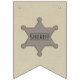 Roligtens buntbanderoll har en brun halshuggare i båda ändar och säger Grattis på födelsedagen med en Sheriffs-bricka mellan ord. cowboyen bär sina blå jeans, en skjorta för koma, rödbandana och en röd cowboyhatt och han rider på sin leksak ponny. Det här blir en så söt dekoration på en cowboypojke party! Finns även i blondinhaltig cowboy och asiatisk cowboy.