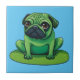 Cute grönt Pug liknar en groda sitta på en lilipad. Bakgrunden till färg kan ändras.