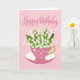 En liten liten rosa tekopp fylld med ett vackert gäng liljor av dalen blommor tillsammans med handskriften ord Grattis på födelsedagen på kortets överkant och handskriften ord 38 i dag med kärlek hjärtan på te kopp. Ett sött födelsedagskort för någon som är speciell på 38 i dag!