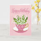 En pittoresk liten rosa tekop fylld med en vacker bukett liljekonvaljblommor tillsammans med de handskrivna orden Grattis på födelsedagen på kortets framsida och de handskrivna orden 64 idag med kärlekshjärtan på tekoppen. Ett sött födelsedags kort för någon speciell som fyller 64 idag!