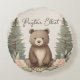 Denna charmiga skogsbarnskabelfestdesign för med sig mysig skogsmagi till varje firande! En söt, storögt björnunge sitter centrerad med ett milt uttryck, omgiven av höga, stiliserade granskogar i mjuka salvia- och grågröna toner. Ömtåliga rosa peonior, krämfärgade rosor och små vita blommor inramar nederdelen, medan subtilt grönska och bär lägger till lager av textur och naturlig värme mot en ljus, drömlik bakgrund.