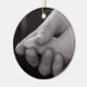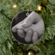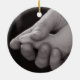 Ornament med ett svart och vitt foto av en liten fot i stor hand.