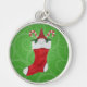 Den här nyckelringen är en grönt med ett snävt mönster och ett rött julstrumpor med en liten gnom med vitt skägg med en röd mörk invändigt omgiven av candy cane och grönt.