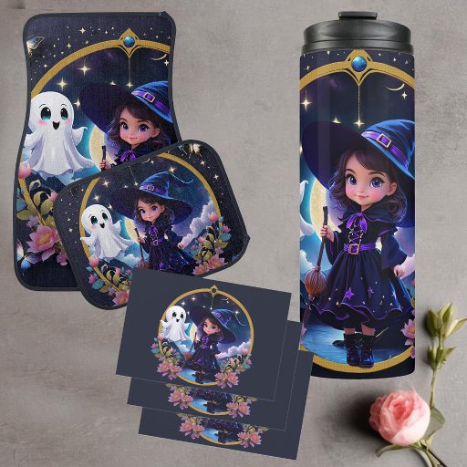 Lite häxa med stort, mousserande ögon. Bredvid henne flyter ett sött spöke som ser vänligt ut och har en lekfull aura. Utformningen förmedlar en känsla av vänskap och magi
