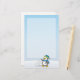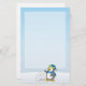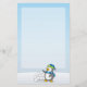 En liten penguin tecknad som väller framför en snöbollsstapel.