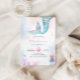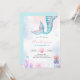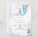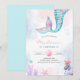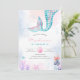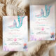 Rolig och färgglad liten sjöjungfru barns födelsedagsinbjudan med vattenfärgssprut bakgrund, sjöjungfrusaga och bubblor.