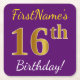 Denna enkla pappra kustfartygdesign presenterar en meddelandenågot liknande"FirstNames 16th födelsedag! " med "16th" ha en faux-/efterföljdguld-något liknande färg som är utseendemässig, på en purpurfärgad kulör bakgrund. Namn kan vara personligen. Något liknande för personligpappersunderlägg dessa kunde kanske användas på en födelsedagsfest för någon som firar deras sextonde födelsedag. [~Z0000197]