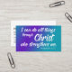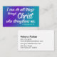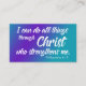 Sätta en klocka på detta, den moderna typografi-baserade designen presenterar den inspirera kristna scripturen, "kan jag göra alla saker till och med Kristus, som förstärker mig," Philippians4:13 på en sida, och ditt specificerar på annan. Ord framförs som en grafisk vit överdrar över ett djärvt, men subtil ombrelutningbakgrund, som presenterar, krickan, blått och lilor på en diagonal lutar. Använd mallfälten på baksidaen för att tillfoga ditt eget specificerar, om du skulle något liknande för att använda detta kort som en affär eller en telefonkort. Om du skulle snarlik använda det som en sötsak långt till uttryckligt din tro och erbjudandeinspiration och uppmuntran, ta bort specificerar från baksidaen och lämnar det ljus vit, så du kan räcka-skrivan noterar lite till dina likadana älskade och främlingar.