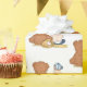 Den gryningen av basket eller den första födelsedagspressen med lite pojke i basebollsockeln och en stor nalle sitta på en baseboll fält.