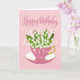 En liten liten rosa tekopp fylld med ett vackert gäng liljor av dalen blommor tillsammans med handskriften ord Grattis på födelsedagen på kortets överkant och handskriften ord 77 i dag med kärlek hjärtan på te kopp. Ett sött födelsedagskort för någon som är speciell på 77 i dag!