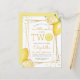 Denna citrusinspirerade lemonadfests inbjudan till andra födelsedagen har en guldram med geometriskt mönster prydd med akvarellmålade citroner. Ordet "TWO" visas i stora gula bokstäver med en akvarellmålad citronskiva i stället för "O". Lägg till din lilla älsklings namn och födelsedag i modern gul handskriven stil och festdetaljerna i kolgrå sans serif. Baksidan av kortet är enfärgat gult. Ett idealiskt tema för en sommarfödelsedagsfest!