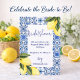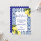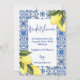 Elegant limoncello bröllopsinbjudan med ljusa akvarellcitroner och blå italienska kakelaccent. Kan anpassas för sommar- eller medelhavsinspirerad bröllopsfirande.