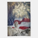 Foto på Abraham Lincolns staty på Lincoln Memorial i Washington DC med vackra exploderande fyrverkerier och USA:s flagga i bakgrunden. Underbar sammansatt bild för amerikanska patriotiska helgdagar firande.