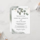 En eucalyptus-utomhusinbjudan är en vackert utformad inbjudan som är perfekt för alla utomhusaktiviteter eller sammankomster. Inbjudan har vanligtvis en elegant och rustik design, med frodiga gröna eucalyptusblad som huvudsaklig fokuspunkt. Bladen fungerar ofta som en naturlig ram eller kant för inbjudans text och grafik, vilket skapar ett sofistikerat och inbjudande utseende.