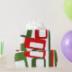 This wrapping paper has a mid-century modern Christmas design of lines and rectangles in retro shades of red and green.