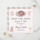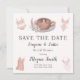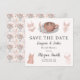Denna charmiga Spara datumet-kort sätter tonen för en Lingerie & Lattes bröllopsdusch, med elegant bröllingsunderkläder, en mysig latte och boho-blommor i en stilren design. Baksidan visar ett fantasifullt mönster av bröllopstårtor, ömtåliga underkläder, blommor och mer.
