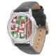 Denna manar har en modern julklapp av linjer och rektanglar i röda nyanser och grönt.