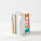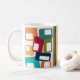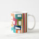 Mugg har en modern utformning av linjer och rektanglar i mitten av århundradet i återskuggor av orange, guld, kranbär, teal, grönt, blått, turkos och grönt.