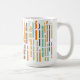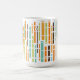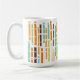 Mugg har en modern utformning av lodrät linjer under 1970-talet i orange, brunt, grönt och blått på en vit fält med vågrät vitt linjer som korsar dem.