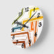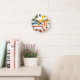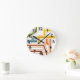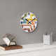 Den här väggklockan har en konsthändelse av linjer i grönt, gult, brun, orange och blått.
