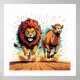 Vibrant comic-style duo of a roaring lion and nimble llama racing in bold colours, perfect for energetic streetwear and youth apparel, capturing motion and wild teamwork.