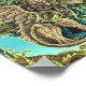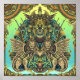 En visuellt slående och komplicerad illustration som skildrar ett mäktigt, bepansrat figur omgivet av vind lejon och ornat, dekorativt inslag. Figur har horn och fjädrar, och deras ögon glöd med intensivt ljus.