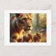 En stor lioness går skyddande med sina två unge genom en solbelyst skog. Golden Hues och den mjuka belysningen skapar en varm och god atmosfär.