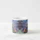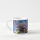Den vackra leonfisken på Espresso Kopp simmar i ett färglöst vattenakvarium. Det är ett originalfoto av ZoeSPEAK som visar mönster på tjocka och tunna fenor av rand och finare på denna ovanliga tittar fisk. Det är ett färgfoto med tropiska blått, gult och rosa av akvariet och fiskens rosa av lax.