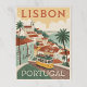 En vektor poster om Lissabon, med röda tak, smala rullgator och den klassiska gulten 28 som rider ner i backe. Inkludera pastel byggnad, tile struktur (azulejos) och några handflatan träd. Använda platt färg som dammig orange, teal och kräm. Rubrik: "LISBON" i fet vintage högst upp, med "PORTUGAL" i mindre sans-serif nedanför.