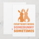 Skicka lite glädje över Påsk med det här charmeringskortet som innehåller två bunny silhouettes och den hjärtliga frasen "Alla behöver lite bunny ibland" i varma bruna nyanser. Perfekt för vänner, familj eller nära och kära som skulle kunna använda lite extra kärlek denna säsong. Vare sig det är för Påsk, vårtid önskemål eller bara ett sött meddelande, är det här kortet ett trevligt sätt att sprida lite kärlek!