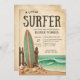Den här vintage-inspirerade inbjudan till babydusch innehåller en rustik surfa med en vättad beige bakgrund, en klassisk grönt-strimlad yfboard-lutning mot ett trästängsel och spridda segeler på sandstranden. Scenen är färdig med turkos över vinkara hav med en liten surfbräda som rider på brunnen och frammanar en nostalgisk vid sidan av charm. Om du behöver någon annan matchande produkt eller anpassning kan du skicka ett vänligt meddelande via Zazzle.