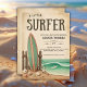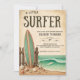 Den här vintage-inspirerade inbjudan till babydusch innehåller en rustik surfa med en vättad beige bakgrund, en klassisk grönt-strimlad yfboard-lutning mot ett trästängsel och spridda segeler på sandstranden. Scenen är färdig med turkos över vinkara hav med en liten surfbräda som rider på brunnen och frammanar en nostalgisk vid sidan av charm. Om du behöver någon annan matchande produkt eller anpassning kan du skicka ett vänligt meddelande via Zazzle.