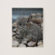 Fotografera av en liten bebiskaninsitta på några stenar på kanten av vatten.