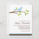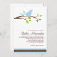 En söt liten blå fågel för en baby shower! Klassiska ränder och prickar pryder denna ljusblå och brun shower inbjudan.