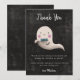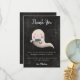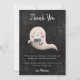 Söt Halloween tema födelsedagsfest tack-kort mall med en illustration av en spöke med en blå fluga på en svart svarta tavlan bakgrund. Meddelandet tackar gästen för att de kommit till festen och för gåvan. Perfekt höst tema för en pojkes födelsedag.