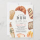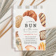 Den här söta "en liten bulle i ugnen" könsneutrala baby shower-inbjudan har olika sorters bröd, som croissant eller baguette i akvarell. Baksidan har en vit bakgrund med beige gingham-ruta/rutor. Anpassa den efter dina behov. Du kan hitta matchande produkter i min butik.